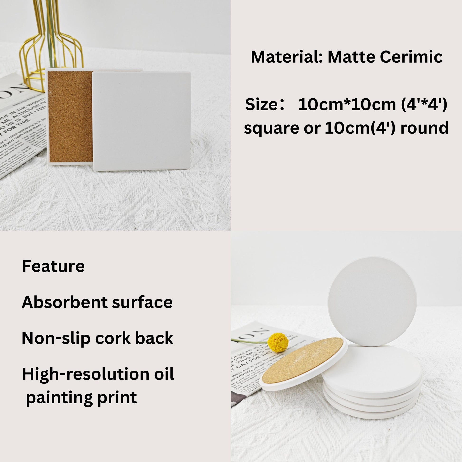 -Material: Matte ceramic with cork backing