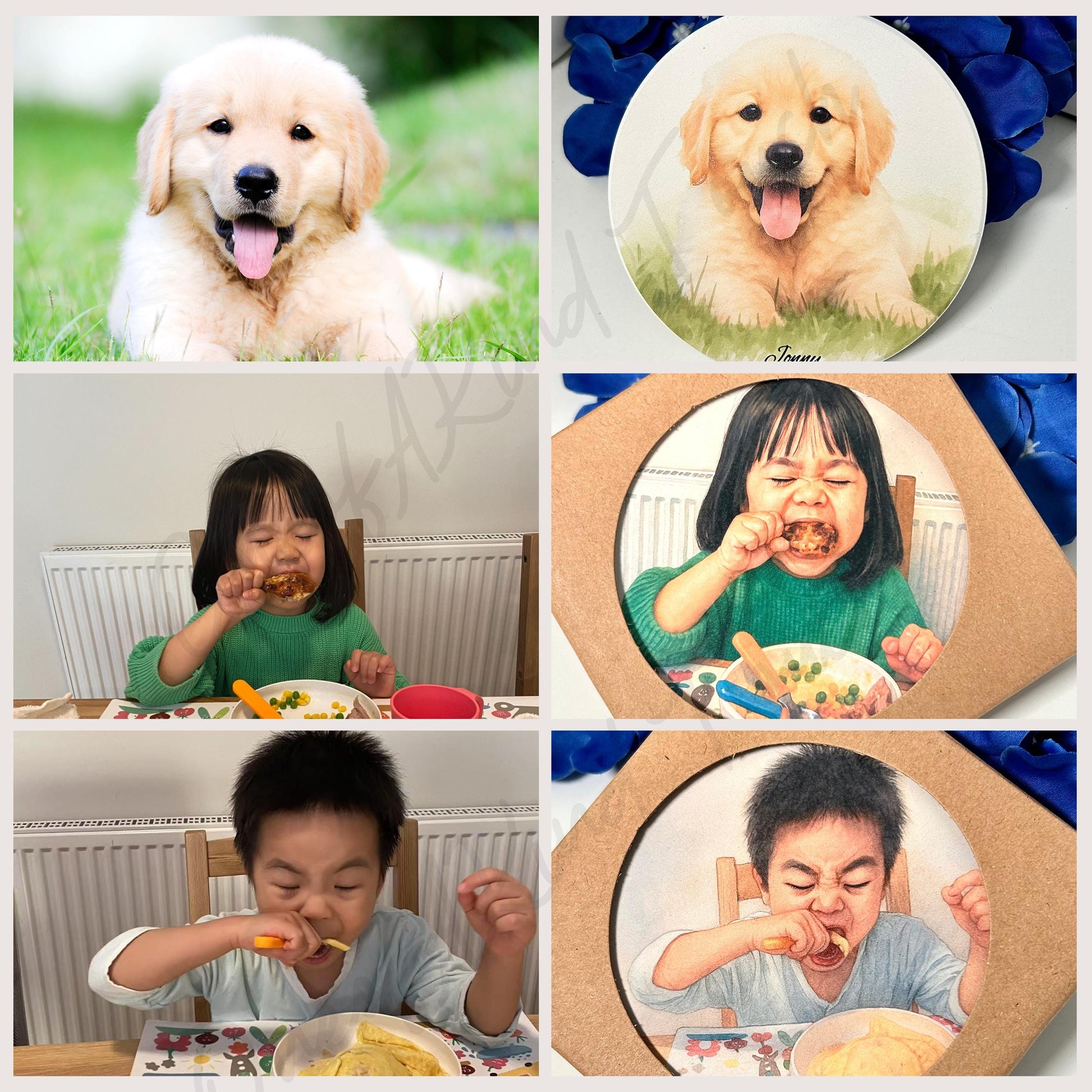 Whether it's your kid mid-bite, your pup being goofy, or your partner's best selfie — we’ll turn it into a hand-drawn style watercolour portrait and print it on a high-quality round coaster with your custom name and message.